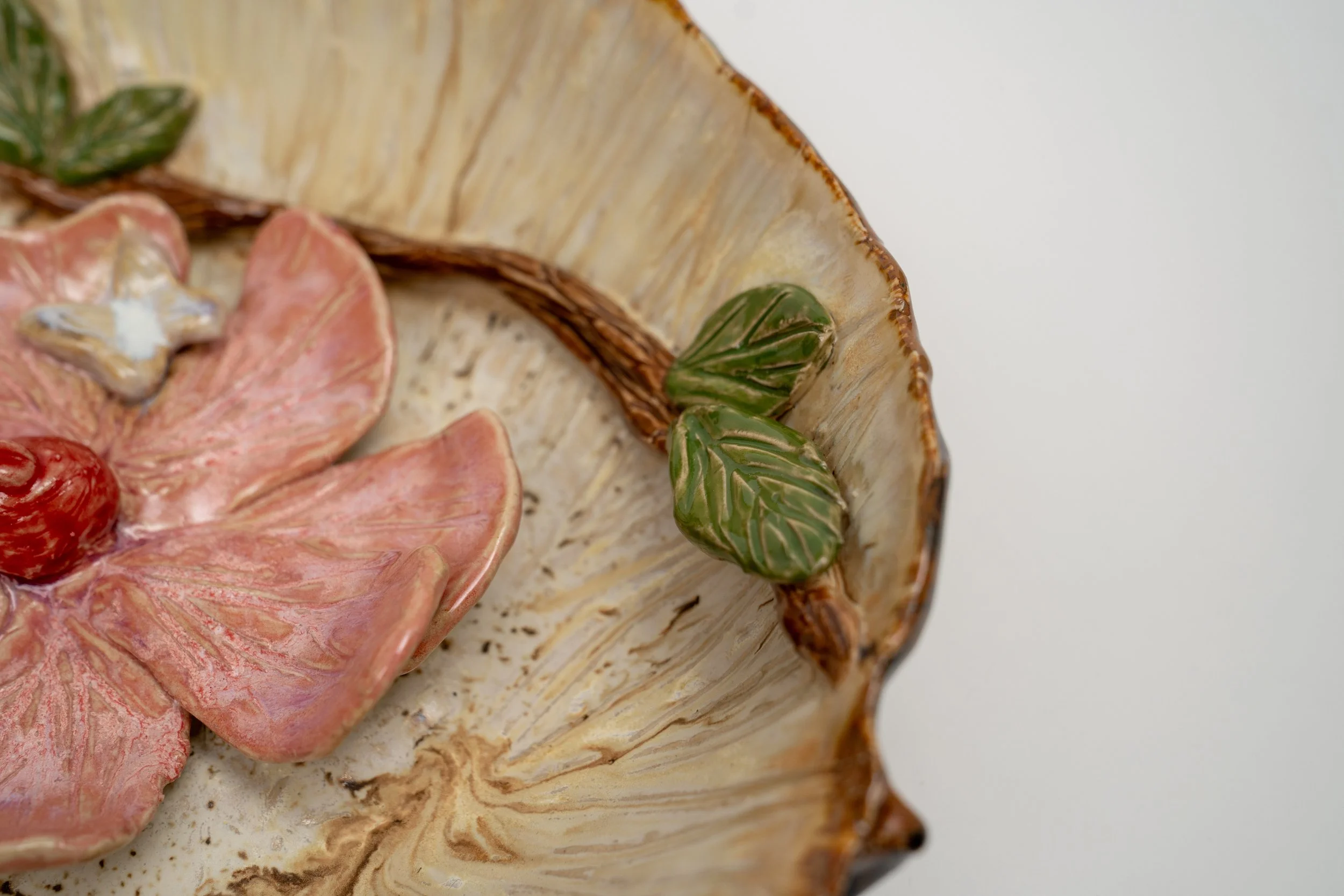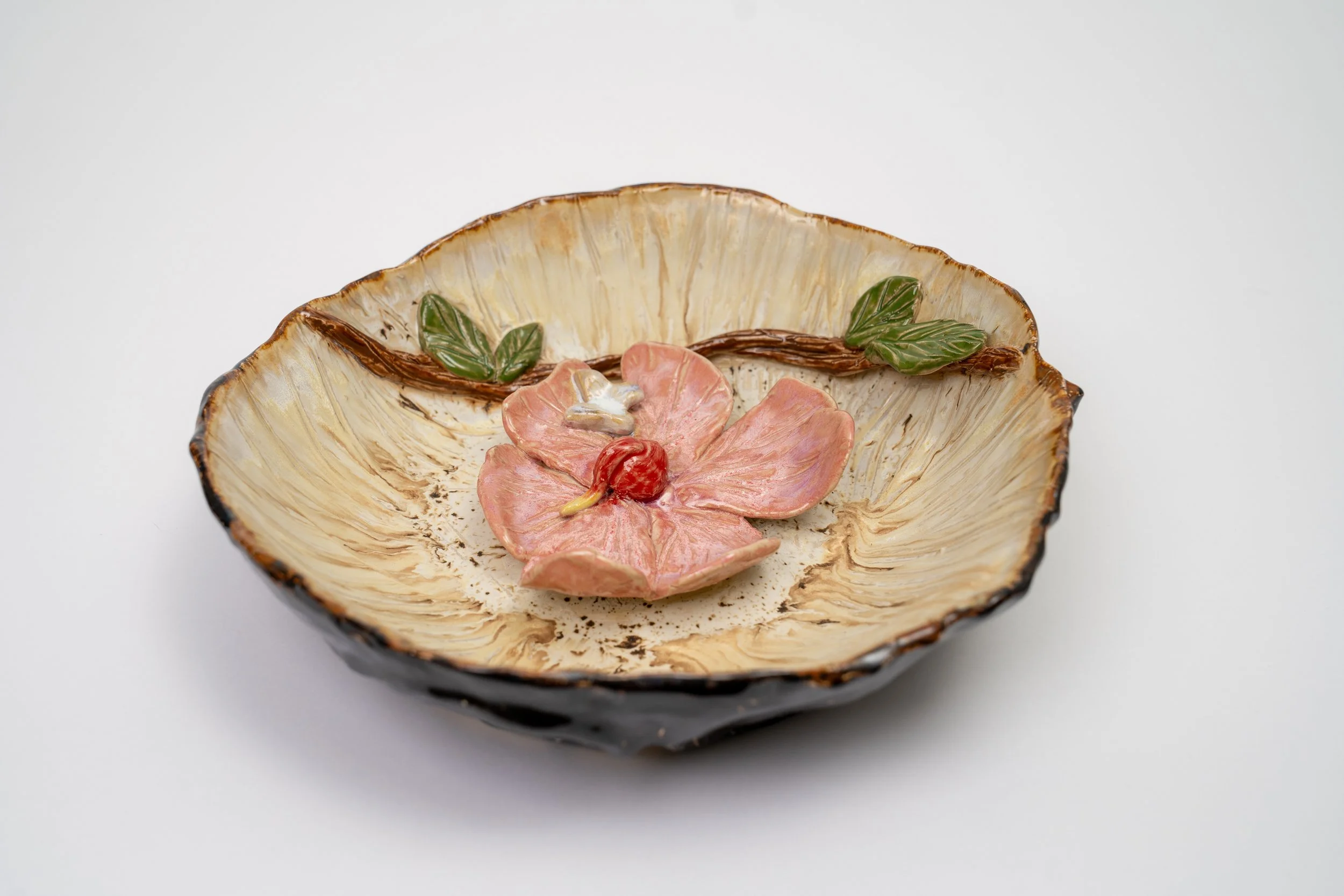 Rather than following rigid plans, I let the clay evolve naturally as I work. I’m drawn to bold forms, layered textures, and experimental glaze combinations that create contrast and depth. Floral influences, organic shapes, and sculptural appliqués often emerge throughout my work.
